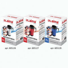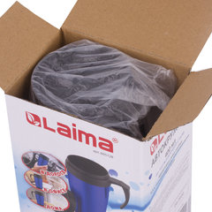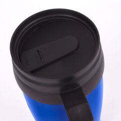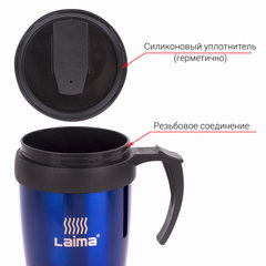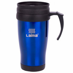 Автокружка 400 мл, термостакан с ручкой, винтовая крышка-клапан, пластик/сталь, синяя, LAIMA, 605128.