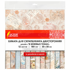 Бумага для скрапбукинга 30х30 см, "В бежевых тонах", двусторонняя, 12 листов, 180 г/м2, ОСТРОВ СОКРОВИЩ, 665437