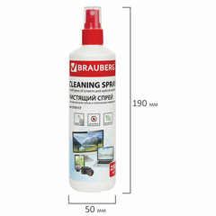 Чистящая жидкость-спрей BRAUBERG обеспечивает идеальное очищение сильно загрязненных поверхностей из стекла: компьютеров, мониторов, мобильных устройств и т.д. Подходит для протирки оптических поверхностей и линз очков.Не содержит спирта и растворителей. Благодаря отсутствию в формуле твердых включений не повреждает поверхность. Объем - 250 мл. Обладает антистатическим эффектом. Размер - 190х50х50 мм.