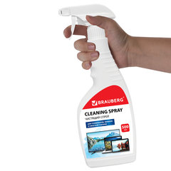 Высокоэффективное средство BRAUBERG для легкой и мягкой очистки всех типов экранов, оптических, стеклянных и пластиковых поверхностей бытовой и офисной техники от пыли, грязи и жирных пятен.Средство объёмом 500 мл быстро удаляет пыль, грязь, следы от высохших капель воды, следы от рук, не дает разводов, не разрушает антибликовых покрытий, быстро высыхает и оставляет защитный слой с антистатическим действием.