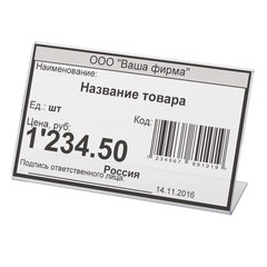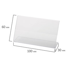 Тип товара: ценникодержатель, Расположение ценника: горизонтальное, Крепление: держатель на подставке, Серия: Standard, Количество в упаковке: 5 шт., Материал: оргстекло, Цвет: прозрачный, Максимальная толщина вставки: 1.5 мм, Ширина верхнего держателя информации: 30 мм, Высота ножки: 1 мм, Высота: 60 мм, Ширина: 100 мм, Глубина: 30 мм, Толщина: 1 мм.