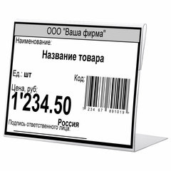 Тип товара: ценникодержатель, Расположение ценника: горизонтальное, Крепление: держатель на подставке, Серия: Price tag, Количество в упаковке: 20 шт., Материал: ПЭТ, Цвет: прозрачный, Максимальная толщина вставки: 1.5 мм, Ширина верхнего держателя информации: 20 мм, Высота ножки: 20 мм, Высота: 50 мм, Ширина: 70 мм, Глубина: 50 мм, Толщина: 0.5 мм.