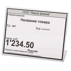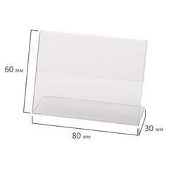 Тип товара: ценникодержатель, Расположение ценника: горизонтальное, Крепление: держатель на подставке, Серия: Standard, Количество в упаковке: 10 шт., Материал: оргстекло, Цвет: прозрачный, Максимальная толщина вставки: 1.5 мм, Ширина верхнего держателя информации: 30 мм, Высота ножки: 1 мм, Высота: 60 мм, Ширина: 80 мм, Глубина: 30 мм, Толщина: 1 мм.