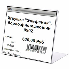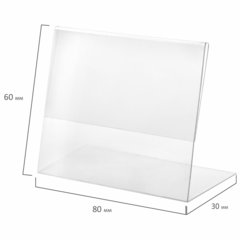 Тип товара: ценникодержатель, Расположение ценника: горизонтальное, Крепление: держатель на подставке, Серия: Price tag, Количество в упаковке: 20 шт., Материал: ПЭТ, Цвет: прозрачный, Максимальная толщина вставки: 1.5 мм, Ширина верхнего держателя информации: 20 мм, Высота ножки: 20 мм, Высота: 60 мм, Ширина: 80 мм, Глубина: 60 мм, Толщина: 0.5 мм.