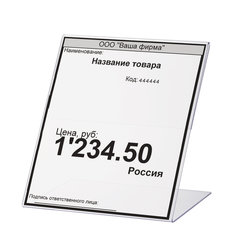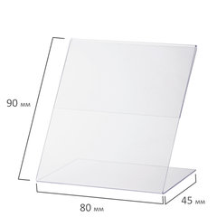 Тип товара: ценникодержатель, Расположение ценника: вертикальное, Крепление: держатель на подставке, Серия: Standard, Количество в упаковке: 10 шт., Материал: оргстекло, Цвет: прозрачный, Максимальная толщина вставки: 1.5 мм, Ширина верхнего держателя информации: 45 мм, Высота ножки: 45 мм, Высота: 92 мм, Ширина: 80 мм, Глубина: 90 мм, Толщина: 1 мм.
