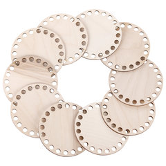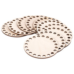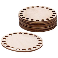 Комплект донышек – это прочный, устойчивый круглый каркас для вязания своими руками, способствующий экономии пряжи. Основа подходит для плетения из шнура, толстых и тонких трикотажных нитей или джута. Заготовки выполнены из березовой фанеры - материала из дерева высшего сорта, по краям набора равномерно распределены отверстия без зазубрин и скосов.