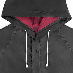 Длина по спинке (от воротника до нижнего края) – 122 см. Полуобхват груди (измеренный на уровне глубины проймы) – 70 см. Длина рукава (от воротника до края) – 86 см. Полуобхват рукава – от 26 см до 20 см. Размеры капюшона (в сложенном виде) – высота 36 см, глубина 26 см. Цвет верха – черный. Цвет внутренней части – темно-красный.