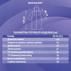 Дождевик-плащ SHAMAANI на кнопках и с капюшоном предназначен для защиты от ветра, дождя и повышенной влажности воздуха. Идеально подойдет для работы на улице, отдыха на природе, рыбалки, пикника и городских прогулок.Дождевик-плащ универсального размера с капюшоном изготовлен из этиленвинилацетата (EVA). Поверхность дождевика рельефная. Застегивается на 6 пар кнопок из полипропилена (PP). В капюшоне есть кулиска с пластиковыми наконечниками. Рукава сужаются книзу. Края рукавов, полочек и низ изделия подогнуты и надежно проклеены.