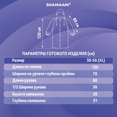 Дождевик-плащ SHAMAANI на кнопках с капюшоном предназначен для защиты от дождя и повышенной влажности воздуха. Идеально подойдет для работы на улице, отдыха на природе, рыбалки, пикника и городских прогулок.Дождевик-плащ универсального размера с капюшоном изготовлен из полиэтилена (PE). Застегивается на 4 пары кнопок из полипропилена (PP). В капюшоне есть кулиска с пластиковыми наконечниками. В рукава вставлены резинки для более плотного прилегания материала к запястью и предотвращения попадания влаги внутрь. Для многоразового использования.