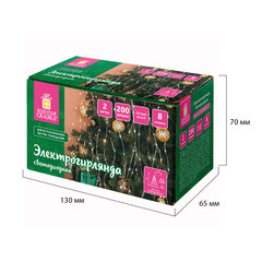 Длина рабочей части гирлянды составляет 2 м. Количество светодиодов – 200 шт. Расстояние между светодиодами – 10 см.