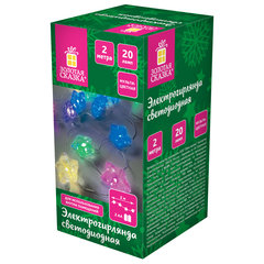 Цвет свечения гирлянды – мультицветный. Конструкцией гирлянды не предусмотрено наличие контроллера для переключения режимов – режим свечения один, и он постоянный. Гирлянда работает от 2 батареек типа AA. Батарейки не входят в комплект! Использование: помещение, Тип электрогирлянды: Нить "Декоративная", Количество режимов: 1, Длина: 2 м, Мощность: 0.6 Вт, Количество ламп: 20 шт., Тип ламп: светодиодная, Форма ламп/фигуры: звезда, Цвет ламп: мультицветный, Цвет провода: прозрачный, Питание: батарейки AA, 2 шт., Упаковка единицы товара: картонная коробка. Код: 592477