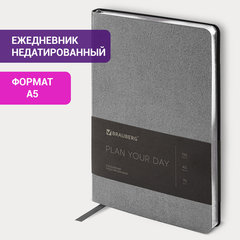 Ежедневник недатированный А5 138х213 мм BRAUBERG "Metallic", под кожу, 136 л., гибкий, серебряный, 113377