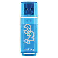 SMARTBUY Glossy – универсальный флеш-накопитель, прост в использовании, позволяет легко и быстро перенести файлы между устройствами.Флеш-диск объемом 32 Гб комплектуется специальной системой для крепления колпачка – с помощью скобки он фиксируется между двумя выступающими пластинками на устройстве. Это очень удобно и минимизирует вероятность потери защитного колпачка. За эту же скобку флешку можно прикрепить к шнурку. Выполнен из прозрачного пластика синего цвета. Размер – 55х18х9 мм. Вес – 10 г.