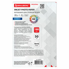 Фотобумага матовая, 10х15 см, 180 г/м2, односторонняя, 50 листов, BRAUBERG ORIGINAL, 363971