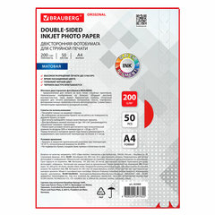 Фотобумага матовая, А4, 200 г/м2, двусторонняя, 50 листов, BRAUBERG ORIGINAL, 363989