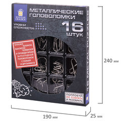 В наборе содержится 16 головоломок разной сложности. Вид игрушки: головоломка, Количество в комплекте: 16 шт., Возраст ребенка: 6+, Цвет: серебристый, Серия: Прокачай мозги, Сюжет: Ассорти, Материал: сталь, Упаковка: картонная коробка. Код: 664928