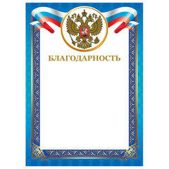 Заголовок: "Благодарственное письмо", Назначение: универсальная, Формат: А4, Материал: импортный мелованный картон, Плотность: 230 г/м2, Изображение российской символики: да, Дизайн: Синяя рамка, Оформление надписи: с конгревным тиснением фольгой.
