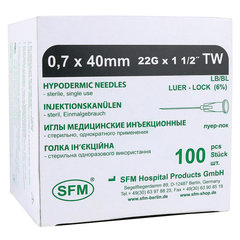 Иглы одноразовые стерильные для шприцев с универсальным креплением, которые подходят для Луер и Луер-Лок.Игла стерильная 0,7 х 40 мм 22G TW SFM TW - тонкая стенка.