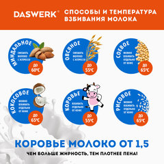 Капучинатор/вспениватель молока DASWERK – это незаменимое устройство для тех, кто любит наслаждаться вкусным кофе в домашних условиях. Создайте пышную пену для любимого напитка за считаные секунды!Многофункциональное устройство может использоваться для взбивания молока, шоколада и других продуктов.