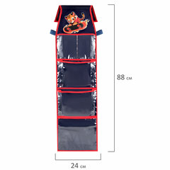 На верхней части органайзера расположен прозрачный ПВХ-кармашек для именной карточки или фото ребенка. Кармашки-органайзер упакованы в плотный ПЭТ-пакет, который сохранит качество и товарный вид при хранении и транспортировке. Назначение: для мальчиков, Возрастная группа: 3-6 лет, Материал: полиэстер, Крепление: липучки, Количество карманов: 5 шт., Размер окошка для имени: 22х9 см, Дизайн: Tiger, Серия: STICKER CLUES, Высота: 88 см, Ширина: 24 см, Цвет: красный/синий, Упаковка: прозрачный пакет. Код: 273285