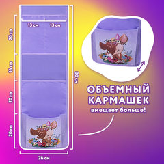 Органайзер имеет 5 карманов: 2 маленьких кармашка для мелочей, 2 средних, а также 1 кармашек увеличенного размера за счет складки для объема. Размер органайзера с кармашками – 26х80 см. Крепление-резинка позволяет размещать кармашки на дверцах шкафчиков разного размера. На верхней части органайзера расположен прозрачный ПВХ-кармашек для именной карточки или фото ребенка.