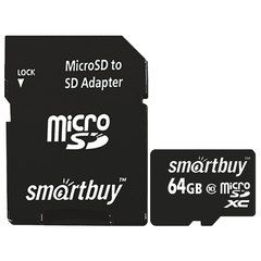 Карта памяти micro SDXC, 64 GB, SMARTBUY, 10 Мб/сек. (class 10), с адаптером, SB64GBSDCL10-01
