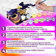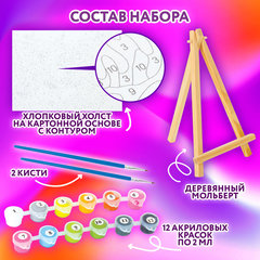 Краски укрывистые, быстро сохнут без потери цвета. Каждый цвет в наборе подходит под конкретный номер, благодаря чему нет необходимости смешивать краски. Однако, если Вы хотите добиться нового оттенка, наши краски с легкостью позволят это сделать, благодаря отличной смешиваемости. 2 синтетические кисти разного размера идеально подойдут для закрашивания элементов различной сложности. Холст из 100% хлопка плотностью 290 г/м2 с высококачественной печатью и отличным натяжением. Небольшой деревянный мольберт можно использовать как в процессе работы, так и в качестве оригинальной подставки для готовой картины. Для лучшего перекрытия контура основы и достижения большей контастности рекомендуем класть краску в 2-3 слоя, после того, как высохнет предыдущий.