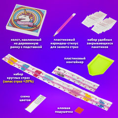 Картина стразами ЮНЛАНДИЯ - это набор для создания уникальной картины своими руками в технике алмазной мозаики - популярного и интересного хобби. Готовая блестящая картина станет отличным подарком или украсит интерьер. Всё необходимое входит в набор.Набор для создания картины стразами "Единорог" включает в себя: - холст, наклеенный на деревянную рамку с подставкой; - набор страз различных цветов, пронумерованных в соответствии со схемой; - удобные закрывающиеся пакетики для хранения страз; - пластиковый карандаш-стилус для захвата страз; - клеевая подушечка; - пластиковый контейнер; - схема соответствия цветов страз и символов на холсте.