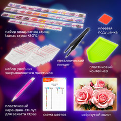 Картина стразами ОСТРОВ СОКРОВИЩ - это набор для создания картины в технике алмазной мозаики. Холст с нанесенным изображением и клеевым слоем заполняется акриловыми стразами. В наборе содержится всё необходимое для создания шедевра своими руками.Картина стразами "Нежность роз" включает в себя: - свёрнутый холст размером 36х46 см; - набор квадратных страз разных цветов, пронумерованных в соответствии со схемой; - набор удобных закрывающихся пакетиков; - металлический пинцет; - пластиковый карандаш-стилус для захвата страз; - клеевая подушечка; - пластиковый контейнер; - схема соответствия цветов страз и символов на холсте.