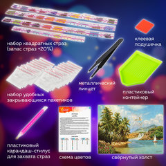Картины стразами ОСТРОВ СОКРОВИЩ - это наборы для создания картин в технике алмазной мозаики. Холст с нанесенным изображением и клеевым слоем заполняется акриловыми стразами. В наборе содержится всё необходимое для создания шедевра своими руками.Картина стразами "Солнце южного моря" представляет собой эксклюзивный сюжет по картине российского художника Разживина И. В. и включает в себя: - свёрнутый холст размером 36х46 см; - набор квадратных страз разных цветов, пронумерованных в соответствии со схемой; - набор удобных закрывающихся пакетиков; - металлический пинцет; - пластиковый карандаш-стилус для захвата страз; - клеевая подушечка; - пластиковый контейнер; - схема соответствия цветов страз и символов на холсте.