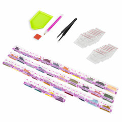 В набор входят: - свернутый холст размером 36х46 см; - набор квадратных страз разных цветов, пронумерованных в соответствии со схемой; - набор удобных закрывающихся пакетиков; - металлический пинцет; - пластиковый карандаш-стилус для захвата страз; - клеевая подушечка; - пластиковый контейнер; - схема соответствия цветов страз и символов на холсте.