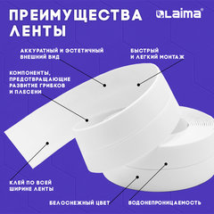 Бордюрная лента LAIMA используется в бытовых условиях для герметизации стыков и швов между раковиной, ванной, столешницами и прилегающими к ним стенами.Устойчива к появлению плесени, полностью водонепроницаема, не растрескивается, не усаживается и не высыхает.