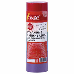 Бумажные клейкие ленты ОСТРОВ СОКРОВИЩ подходят для использования в скрапбукинге, декорирования поделок, открыток, оформления подарков. Декоративные ленты легко приклеиваются и надежно фиксируются на любой поверхности, придавая изделиям оригинальный вид.В наборе содержится 7 бумажных лент всех цветов радуги на полупрозрачной клеевой основе, каждая из которых намотана на пластиковую втулку. Ширина ленты 15 мм позволяет наклеить её даже на небольшие поделки, а длина 3 м даёт большой простор для творчества.