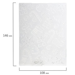 Клише для тиснения просты и удобны в использовании. Необходимо открыть папку, вложить в неё лист бумаги, картона или другого материала, закрыть папку и уложить в машинку для вырубки и тиснения ОС-5 в соответствии с инструкцией, входящей в набор машинки. Могут быть использованы и с другими машинками для вырубки и тиснения формата А5. Размер: 108х146 мм, Цвет: прозрачный, Рисунок: новогодний, Серия: Рельеф, Материал: пластик, Упаковка: пакет с европодвесом. Код: 663802