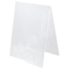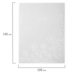 Клише для тиснения просты и удобны в использовании. Необходимо открыть папку, вложить в неё лист бумаги, картона или другого материала, закрыть папку и уложить в машинку для вырубки и тиснения ОС-5 в соответствии с инструкцией, входящей в набор машинки. Могут быть использованы и с другими машинками для вырубки и тиснения формата А5. Размер: 108х146 мм, Цвет: прозрачный, Рисунок: цветы, Серия: Рельеф, Материал: пластик, Упаковка: пакет с европодвесом. Код: 663798