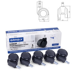 Тип товара: колеса, Количество в комплекте: 5 шт., Серия: Колеса (ролики) BRABIX, Диаметр: 50 мм, Нагрузка: 225 кг, Диаметр основания штока: 28 мм, Соответствует требованиям ГОСТа: нет, Материал: пластик/полиуретан, Цвет: черный.