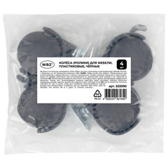 Колеса (ролики) для мебели, пластиковые d 35 мм, КОМПЛЕКТ 4 шт., черные, в пакете, WBZ (ВБЗ), 533090