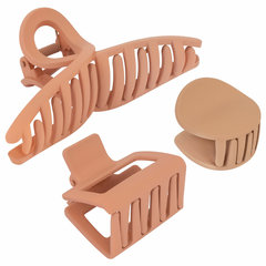 Тип товара: набор крабов для волос, Форма: ассорти, Тип покрытия: soft-touch, Цвет: светло-коричневый, Декор: нет, Набор: да, Количество в наборе: 3 шт., Размер: 4 / 5 / 11 см, Материал: полистирол, Серия: -, Упаковка: картонная карточка с европодвесом.