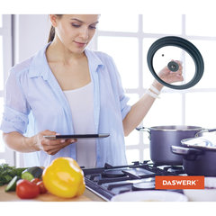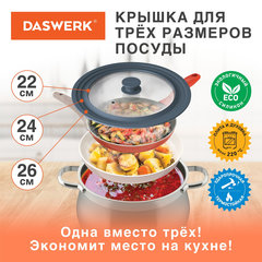 Универсальная крышка DASWERK, выполненная из силикона и стекла, позволит сэкономить не только время, но и пространство на кухне: одну крышку можно использовать для посуды разных размеров: 22 см, 24 см и 26 см в диаметре.Крышка DASWERK изготовлена из термостойкого стекла, что позволяет контролировать процесс приготовления без потери тепла. Ободок из экологичного жаропрочного силикона выдерживает температуру до 220 °С.