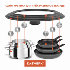 Крышка для любой сковороды и кастрюли универсальная 3 размера (24-26-28 см) серая, DASWERK (ДАСВЕРК), 607591