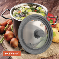 Универсальная крышка DASWERK, выполненная из силикона и стекла, позволит сэкономить не только время, но и пространство на кухне: одну крышку можно использовать для посуды разных размеров: 24 см, 26 см и 28 см в диаметре.Крышка DASWERK изготовлена из термостойкого стекла, что позволяет контролировать процесс приготовления без потери тепла. Ободок из экологичного жаропрочного силикона выдерживает температуру до 220 °С.