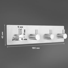 Крючки в количестве 4-х штук на общей планке, размер основания - 18 x 4,5 см. Цвет - серебристый. Выдерживают вес до 50 кг.