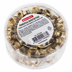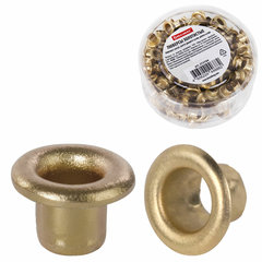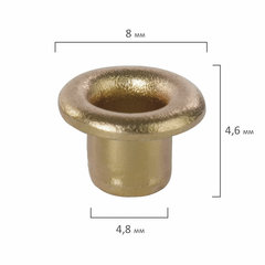 Вид изделия: люверсы, Материал: металл, Серия: Standard, Длина: 4.6 мм, Диаметр: 4.8 мм, Цвет: золотой, Количество в упаковке: 250 шт., Тип упаковки: пластиковый цилиндр.