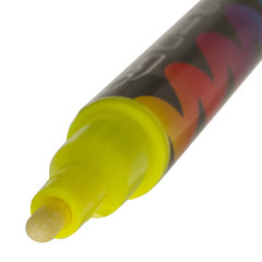 Предназначен для росписи, создания рисунков и надписей на зеркалах, стекле, меловой пленке и прочих гладких и прозрачных невпитывающих поверхностях. Рисунок получается плотный и яркий. Чернила на водно-меловой основе желтого цвета без резкого запаха. Толщина линии письма - от 1 мм до 3,5 мм, зависит от угла наклона мелового маркера. Круглый корпус выполнен из пластика.