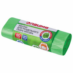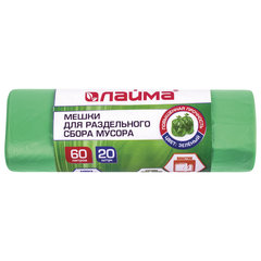 Мешки для раздельного сбора мусора 60 л зеленые в рулоне 20 шт., ПНД 10 мкм, 58х68 см, LAIMA, 606704, 3835