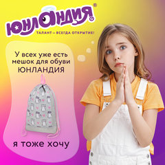 Мешок для обуви - необходимый аксессуар в школе. Подходит как для обуви, так и для физкультурной формы и сменной одежды для факультативных занятий. Затягивается двумя шнурками. Можно носить на плечах за спиной.Мешок ЮНЛАНДИЯ изготовлен из плотного полиэстера с водоотталкивающей пропиткой. Яркая и четкая печать дизайна на мешке достигнута за счет высококачественной ткани высокой плотности.