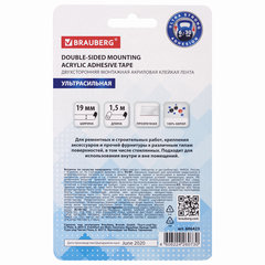 Монтажная прозрачная суперпрочная двухсторонняя лента 19 мм х 1,5 м, акриловая, 1 мм, BRAUBERG, 606423