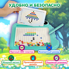 Детская развивающая магнитная игрушка "Крокодил" в виде мозаики с разноцветными пуговками станет для ребёнка источником неограниченного креатива и хорошего настроения.В набор входит игровое поле в виде крокодила, изготовленное из прочного ABS-пластика. Игровое поле накрыто прозрачным акриловым экраном. На игровом поле предусмотрено 180 ячеек для цветной мозаики. Под акриловым стеклом располагается цветная магнитная мозаика в количестве 101 штуки. В комплект также входит стилус из ABS-пластика с магнитным наконечником и 10 двусторонних карточек с заданиями.