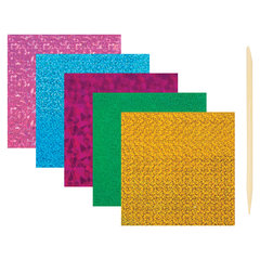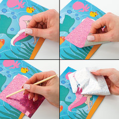 При помощи деревянной палочки, входящей в комплект, необходимо снять с элементов рисунка защитный слой бумаги и к показавшемуся клеевому слою приложить лист фольги цветной стороной вверх, тщательно разгладив всю поверхность элемента деревянной палочкой. При снятии фольги цветной слой остаётся на картонной основе, окрашивая её таким образом в блестящие цвета.