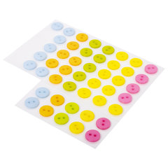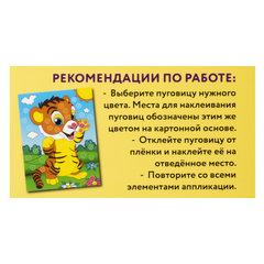 Цветом и контуром на картинке обозначены места, куда необходимо приклеить пуговицы соответствующего цвета. Пуговицы размещены на прозрачной плёнке и имеют клеевой слой, что позволяет создать аппликацию без клея. В каждом наборе имеются запасные элементы.